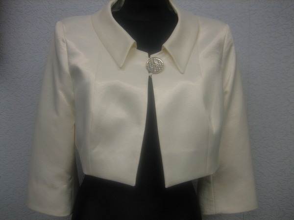 Цвет теплый белый (айвори). Ткань очень интересная - что-то типа атласа, только плотного, перламутрового. Маркировка 46 (на 52 размер).